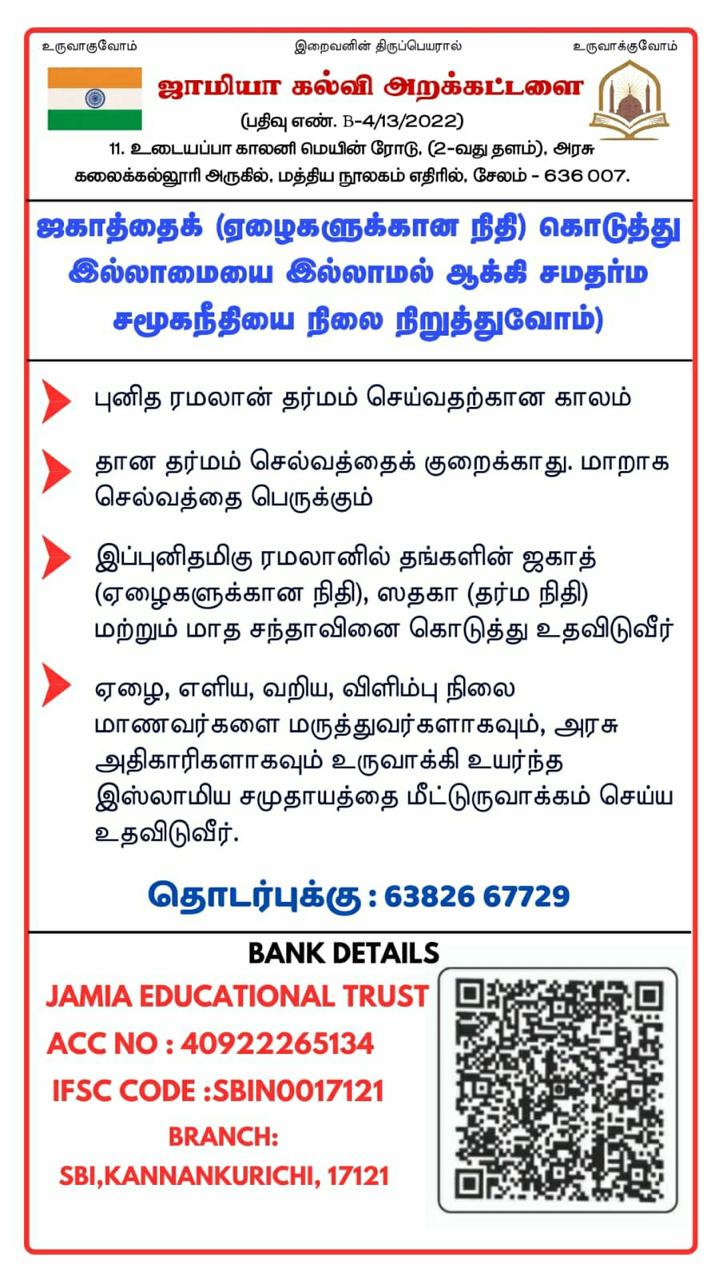 JAMIA EJUCATIONAL TRUST 16/49A, First Floor, Jamia Masjid, First Agraharam, Salem – 636001.